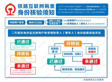 身份信息核驗狀態(tài)為“已通過”、“預(yù)通過”的注冊用戶和常用聯(lián)系人,可在12306網(wǎng)站正常辦理購票業(yè)務(wù);其他狀態(tài)的注冊用戶和常用聯(lián)系人需要確認(rèn)在12306網(wǎng)站所填信息的正確性,或持相關(guān)證件原件到車站窗口或代售點辦理身份信息核驗。12306網(wǎng)站提示“身份信息重復(fù)”的注冊用戶,用戶本人(不可代辦)須持在網(wǎng)站注冊時填寫的有效身份證件原件,到車站售票窗口辦理。